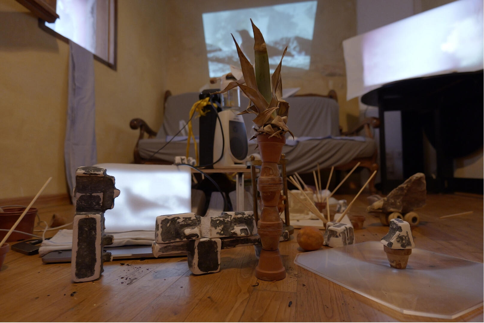 écran TV, ordinateur, vidéoprojecteur, sculptures et objets divers, papiers, tissus, matériaux naturels et artificiels, moules en plâtre, terre cuite, roches, allumettes, lentille de Fresnel.*