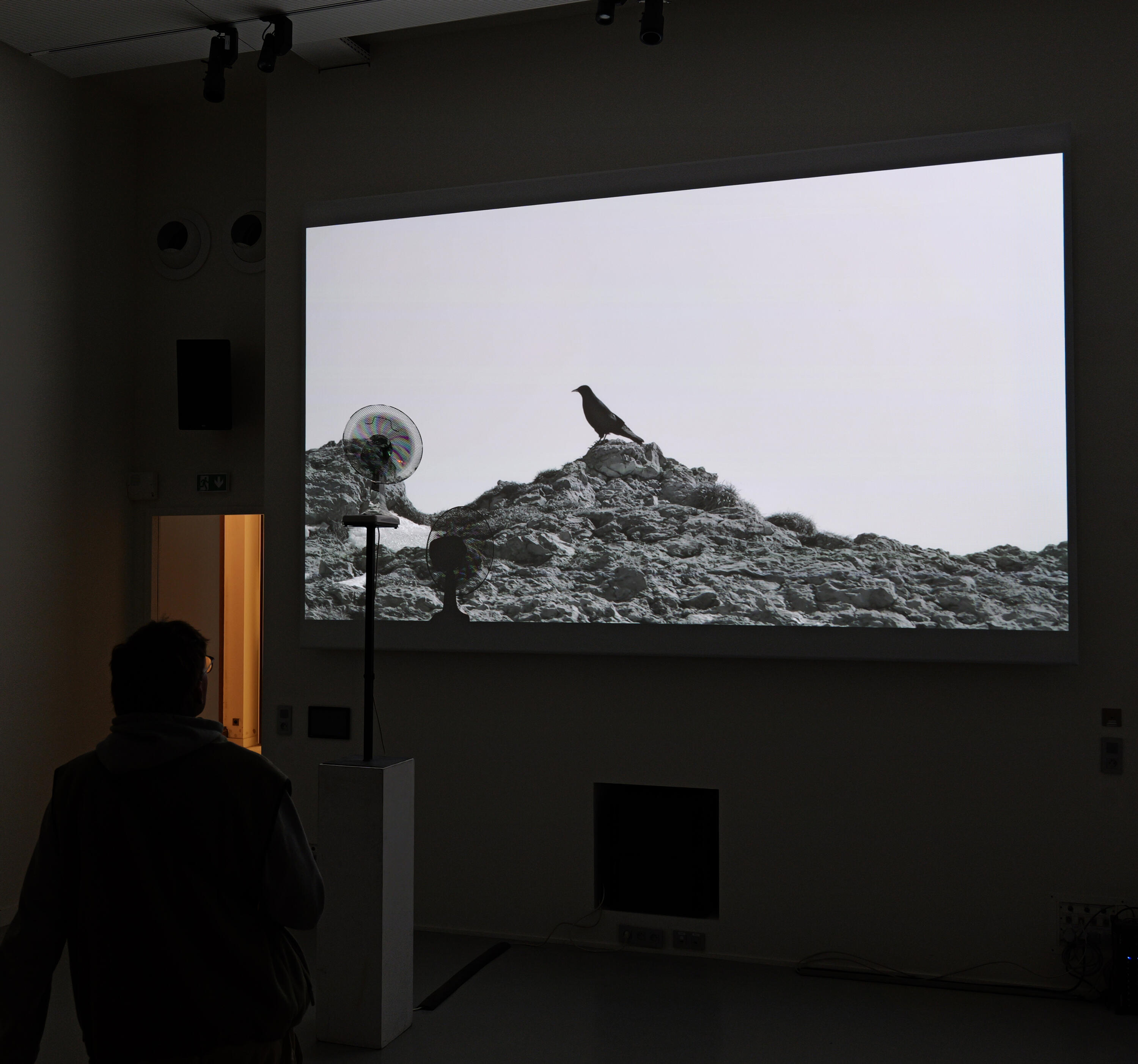 Légende: Des petites sculptures d'assemblages arpentent le vieux parquet, un mémoire au sol enroulé dans un tissu et à côté le premier avion origami brisé. Une pille de feuille A4 aplati par une forme minérale provenant d'une grotte. Le ventilateur, lui, ressemblant à un pistolet-micro projette l’ombre de son enquête sur le paysage projeté par le projecteur qui se déplie devant lui, les oiseaux nageant.