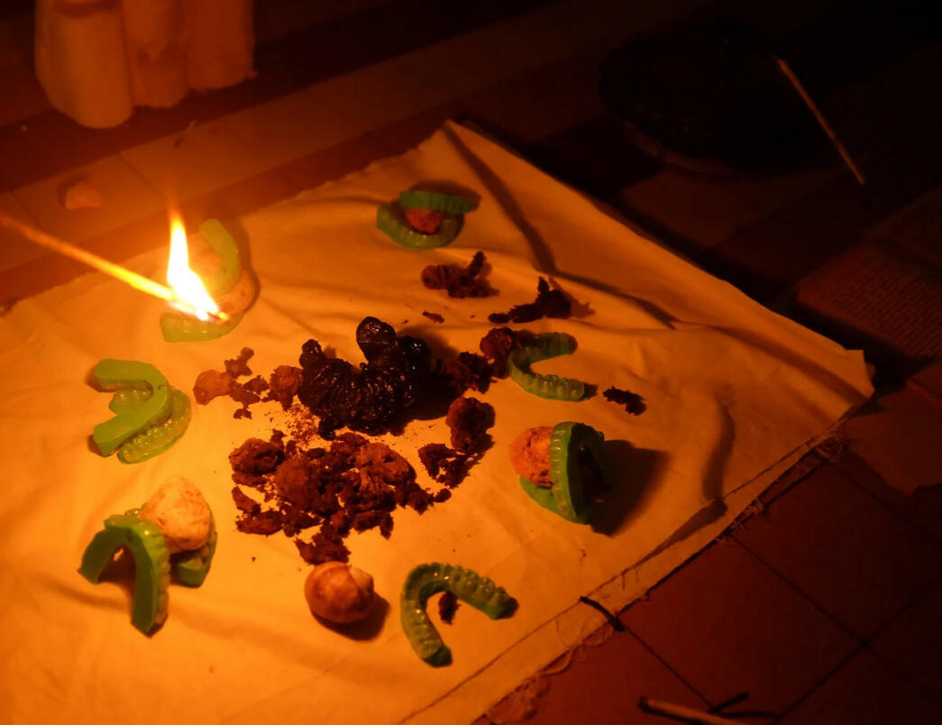 Traces: 2024-2025: Installation intermédia - performance - valise en fer, allumettes, scotch de peintre, socle, roche de montagne, pots, moulages en plâtres, quignons de pain, pain de campagne récupéré en poubelle, terre de Provence, argile