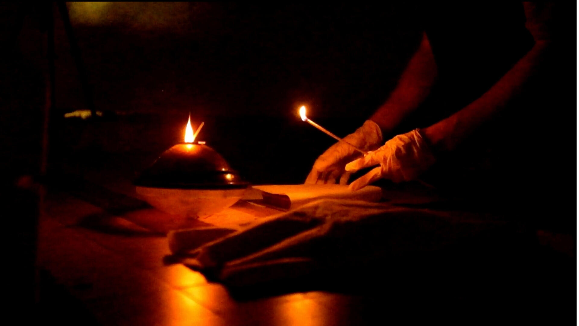 Je procède toujours en deux temps, en deux traces. L'une est plus éphémère que l'autre (1° installation immersive - performance) - (2° Montage vidéo - Projection vidéo)Dans cette performance je révèle des images devant la source de lumière.