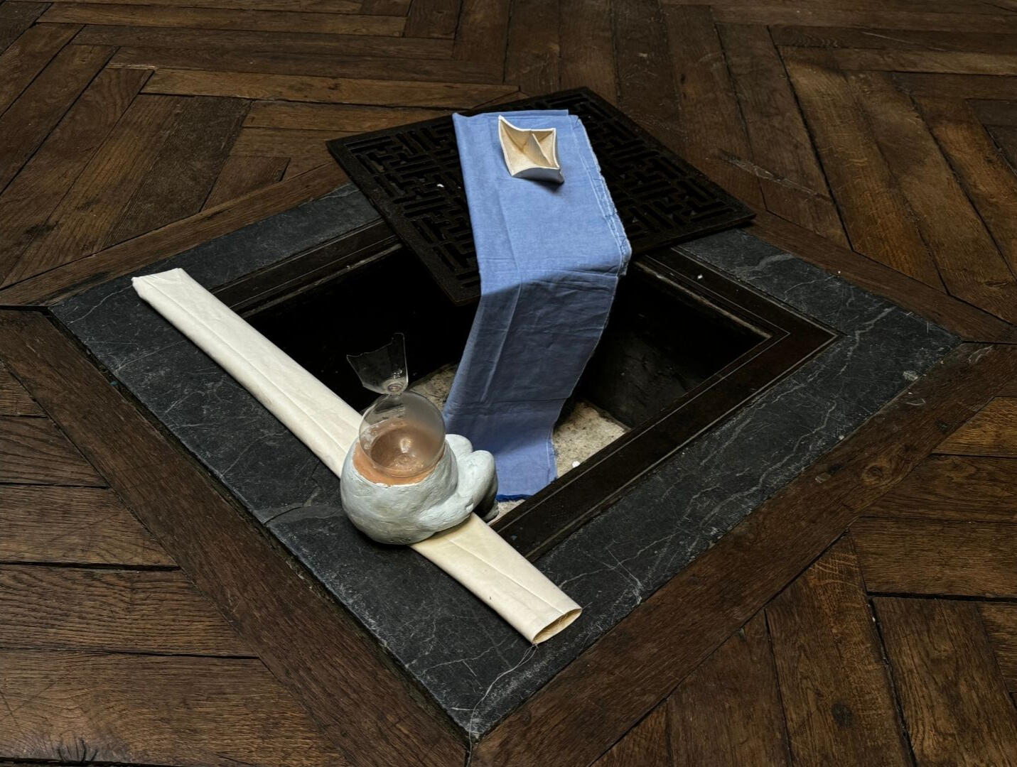ici je suis venus avec mes sacs ventrus, j'ai pris un temps à observer et écouter l'espace et surtout le sol. J'ai voulue jouer avec Les Trappes et proposer une performance qui expérimente la durée d'attention aux choses que nous regardons.Je suis une sorte de guide silencieux qui vient cadencer chaque petite installations d'objets jusqu'à entrer dans la case projection vidéo et faire partie de l'installation en tant que sculpture vivante.Les formes installés proviennent de mes différentes rencontres dans mon expériences des beaux arts. Chaque chose disposé sur ce vieux parquet est fruit de rencontres qui viennent se recueillir, dialoguer avec la trappeEx: le draps bleuté gonflé par un léger courants d'air et sa petite cloche. Deux souliers dans et hors la trappe au sol incliné.