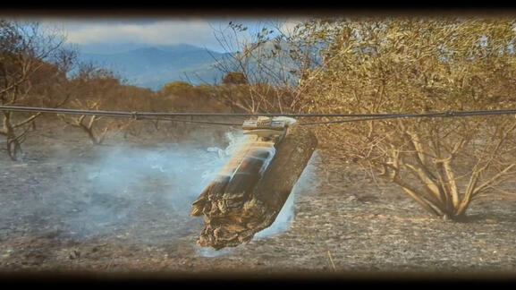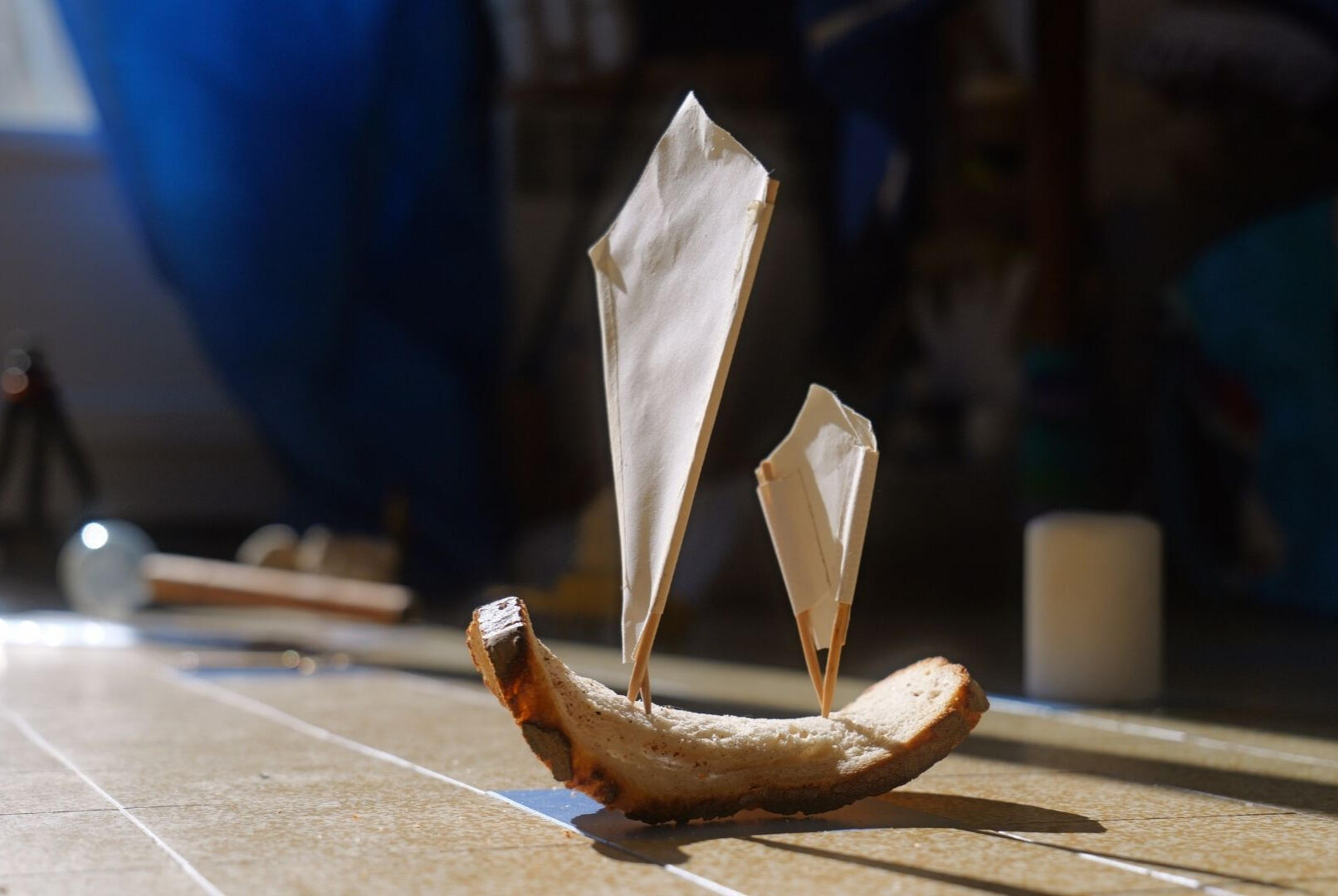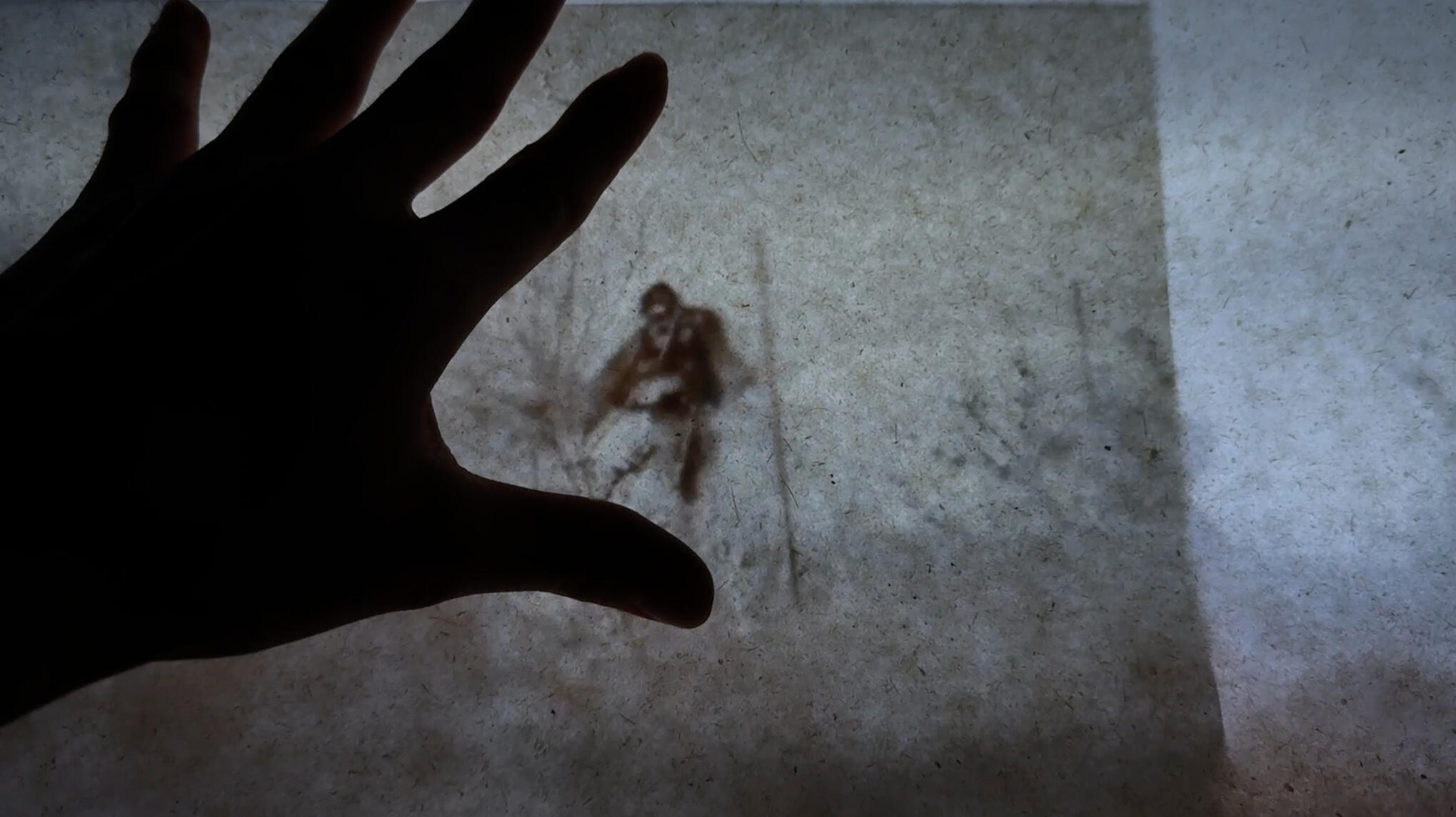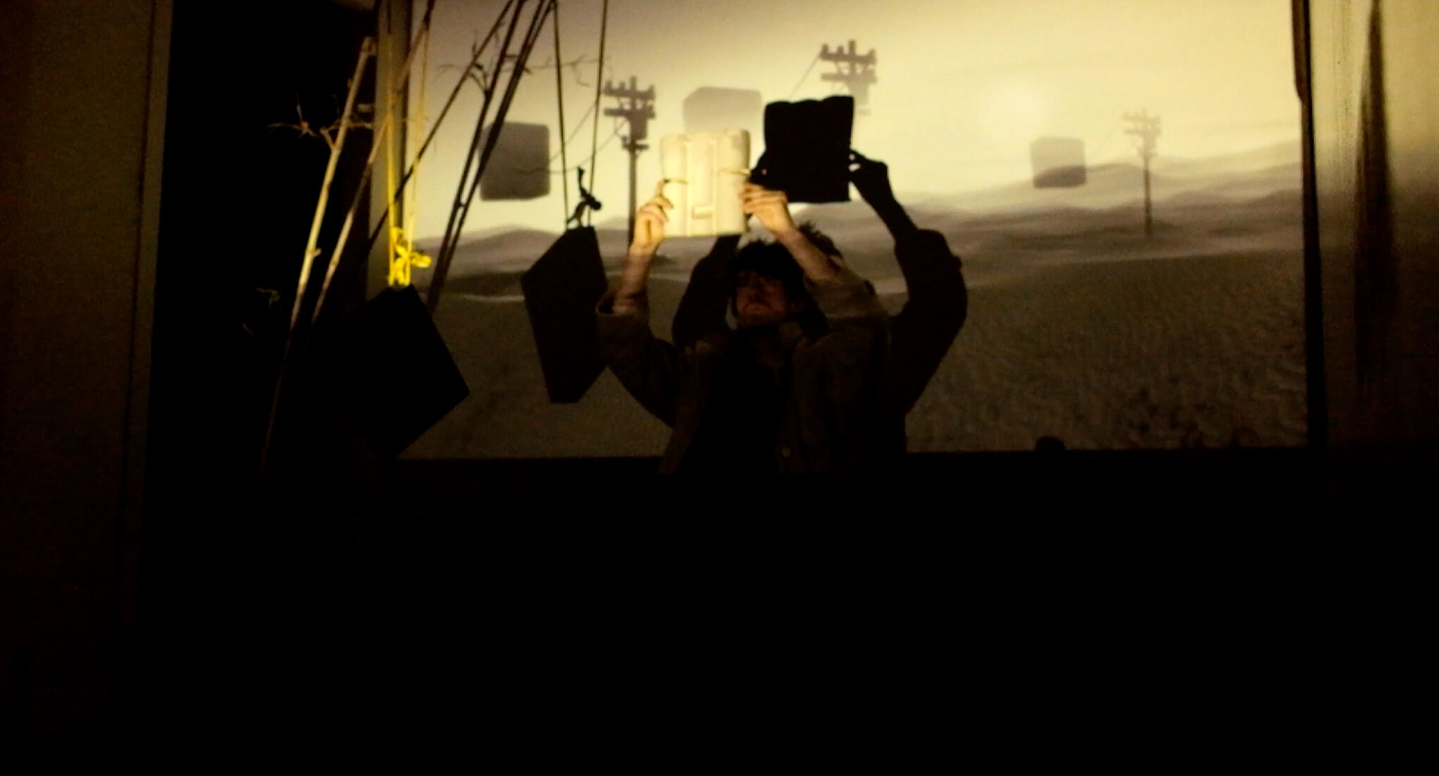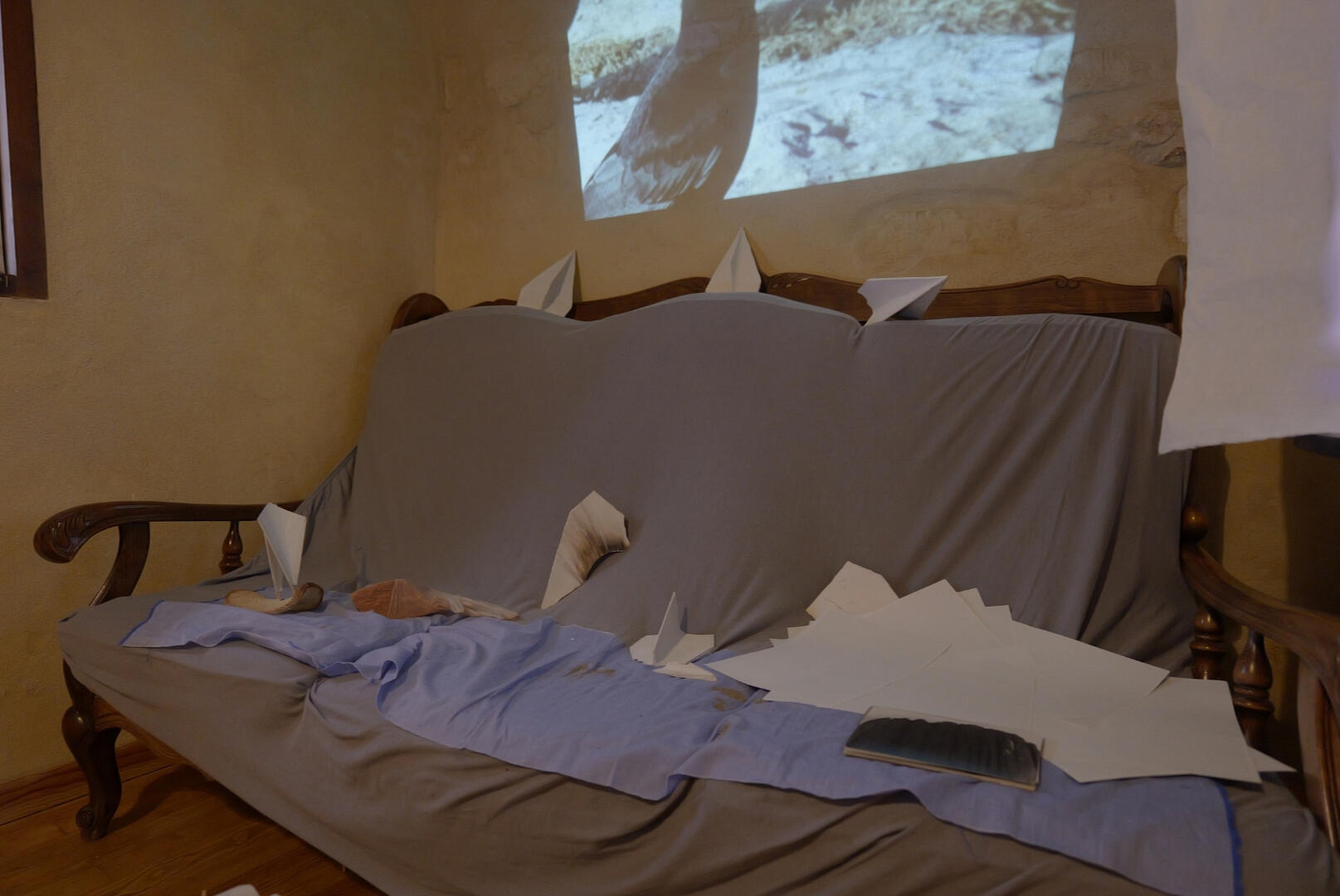 Légende: Des petites sculptures d'assemblages arpentent le vieux parquet, un mémoire au sol enroulé dans un tissu et à côté le premier avion origami brisé. Une pille de feuille A4 aplati par une forme minérale provenant d'une grotte. Le ventilateur, lui, ressemblant à un pistolet-micro projette l’ombre de son enquête sur le paysage projeté par le projecteur qui se déplie devant lui, les oiseaux nageant.