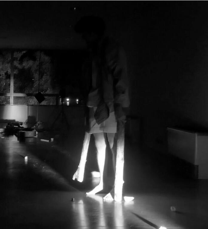 ici je suis venus avec mes sacs ventrus, j'ai pris un temps à observer et écouter l'espace et surtout le sol. J'ai voulue jouer avec Les Trappes et proposer une performance qui expérimente la durée d'attention aux choses que nous regardons.Je suis une sorte de guide silencieux qui vient cadencer chaque petite installations d'objets jusqu'à entrer dans la case projection vidéo et faire partie de l'installation en tant que sculpture vivante.Les formes installés proviennent de mes différentes rencontres dans mon expériences des beaux arts. Chaque chose disposé sur ce vieux parquet est fruit de rencontres qui viennent se recueillir, dialoguer avec la trappeEx: le draps bleuté gonflé par un léger courants d'air et sa petite cloche. Deux souliers dans et hors la trappe au sol incliné.