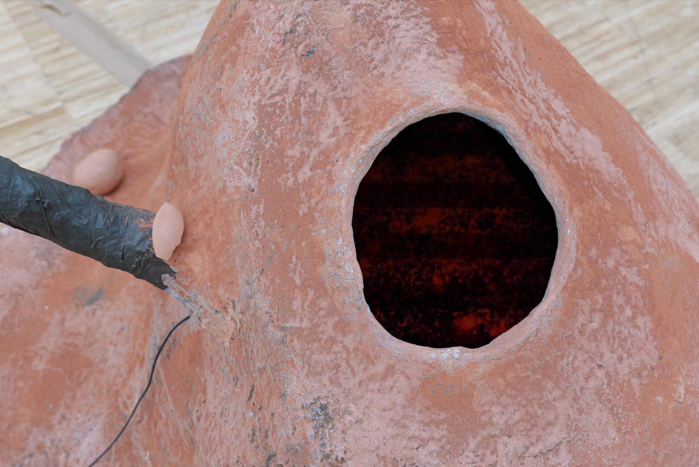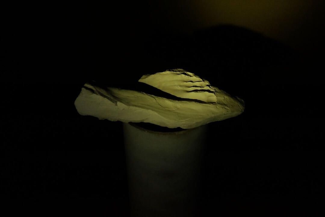Traces: 2024-2025: Installation intermédia - performance - valise en fer, allumettes, scotch de peintre, socle, roche de montagne, pots, moulages en plâtres, quignons de pain, pain de campagne récupéré en poubelle, terre de Provence, argile