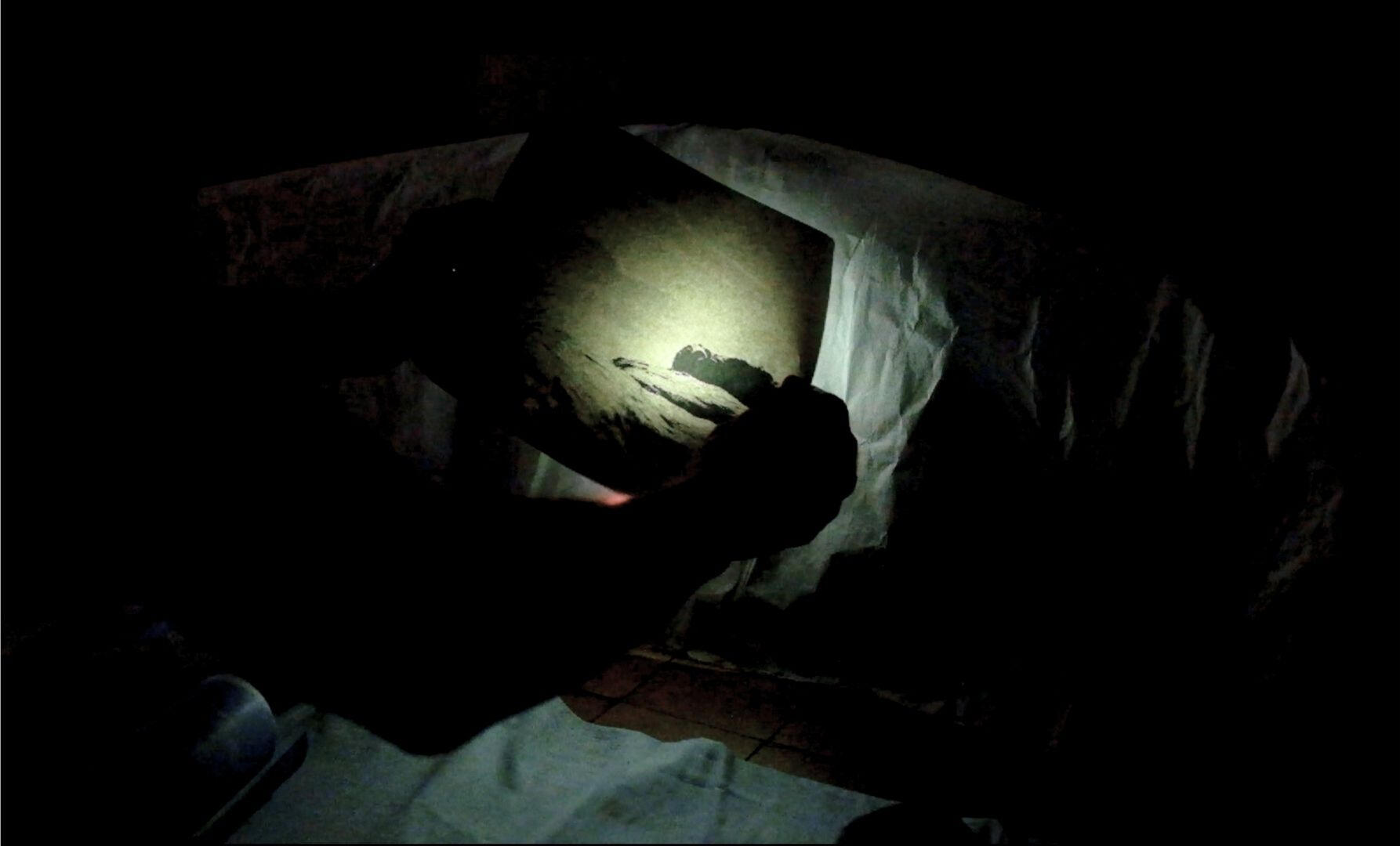 Légende: Des petites sculptures d'assemblages arpentent le vieux parquet, un mémoire au sol enroulé dans un tissu et à côté le premier avion origami brisé. Une pille de feuille A4 aplati par une forme minérale provenant d'une grotte. Le ventilateur, lui, ressemblant à un pistolet-micro projette l’ombre de son enquête sur le paysage projeté par le projecteur qui se déplie devant lui, les oiseaux nageant.